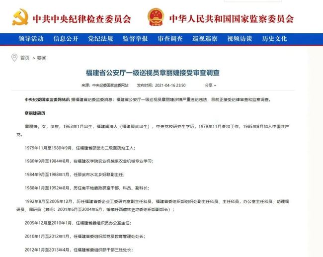 中央紀委國家監(jiān)委網(wǎng)站訊據(jù)福建省紀委監(jiān)委消息:福建省公安廳一級巡視員章麗婕涉嫌嚴重違紀違法,目前正接受紀律審查和監(jiān)察調(diào)查。