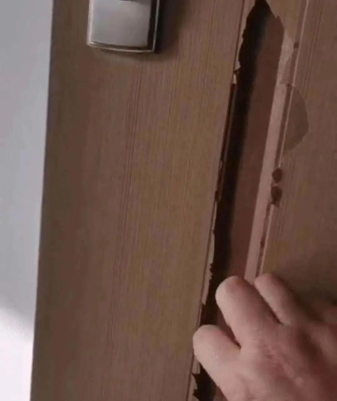從公眾號發(fā)布視頻截圖中可以看到,一名業(yè)主從木門破裂處輕輕撕拽木門貼皮,結(jié)果這木門的貼皮竟然像紙片一樣被輕松撕下,露出粗糙的內(nèi)芯。