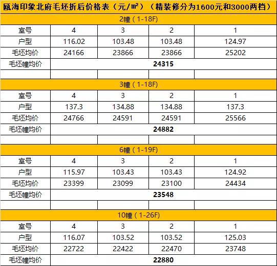 甌海印象北府一期整體折后毛坯均價23851元/㎡(94折),精裝修標準分為1600元和3000元兩檔(精裝參與折扣)。