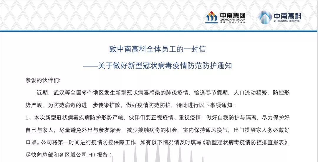 中南高科從一張《新型冠狀病毒疫情防控排查報表》做起,確保分布在全國各地的每一位員工的健康與平安。同時,高科響應(yīng)國家“不聚眾,防疫情”的號召,向員工們一再倡導(dǎo)“針對各類媒體及信息,要理性分析,相信政府,相信科學(xué),不傳播謠言,不傳播負(fù)面新聞”,穩(wěn)定員工情緒。