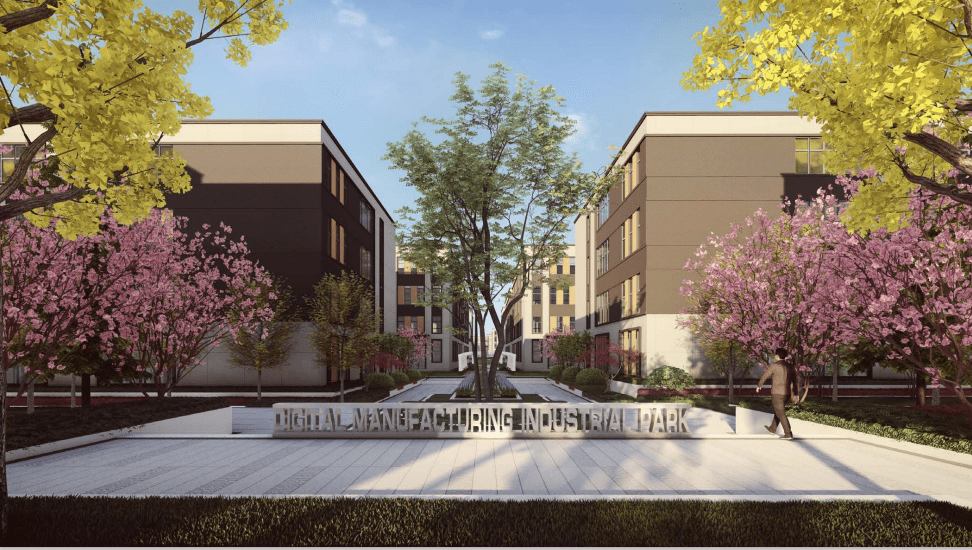 中南高科新建數(shù)字化智造產(chǎn)業(yè)園項(xiàng)目總占地約261畝,總投資超10億元,預(yù)計(jì)全部建成后引入企業(yè)九十多家,一期開發(fā)58棟,產(chǎn)品面積段從600—7200㎡,可支持企業(yè)定制。目前,項(xiàng)目一期工程已進(jìn)入全面施工階段,1#、3#、6#、7#、8#、9#已全面封頂。一軸、兩心、多組團(tuán)景觀帶,借以故宮午門形象,溯本求源承新,禮序中軸重構(gòu),打造春有花、夏有蔭、秋有葉、冬有景的花園式產(chǎn)業(yè)辦公環(huán)境,給予企業(yè)貴賓級(jí)入園感受。