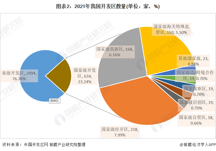截至2021年4月26日,我國共有各類國家級開發(fā)區(qū)634家,其中國家級經(jīng)濟技術開發(fā)區(qū)共有218家,國家級高新技術產(chǎn)業(yè)開發(fā)區(qū)共有168家,國家級海關特殊監(jiān)管區(qū)150家,國家級邊/跨境經(jīng)濟合作區(qū)共有19家,國家級自貿(mào)區(qū)共有18家,國家級新區(qū)共有19家,國家級自主創(chuàng)新示范區(qū)共有19家,其他國家級開發(fā)區(qū)共有23家;省級開發(fā)區(qū)共有2094家。