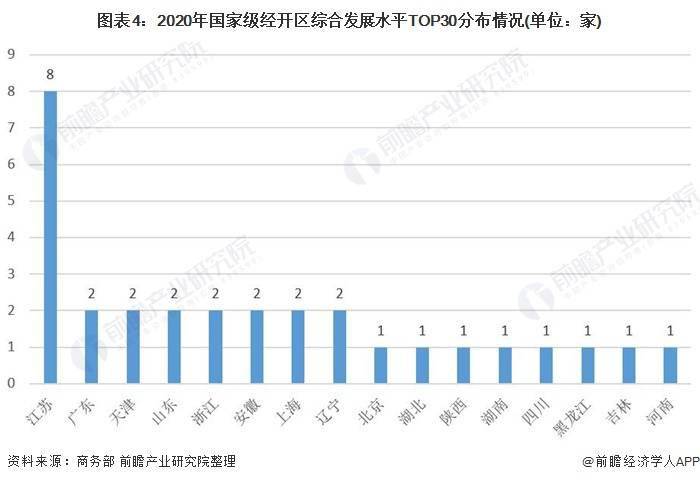 2021年1月27日,商務部發(fā)布2020年國家級經(jīng)濟技術開發(fā)區(qū)綜合發(fā)展水平考核評價結(jié)果。綜合發(fā)展水平進入前30名的國家級經(jīng)開區(qū)依次分布在江蘇8家,廣東、天津、山東、浙江、安徽、上海、遼寧等各有2家,北京、湖北、陜西、湖南、四川、黑龍江、吉林和河南等各有1家。