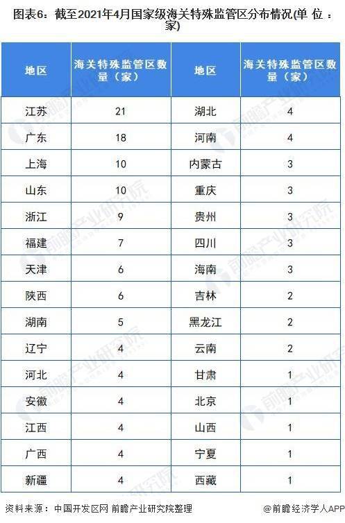 截至2021年4月26日,全國共有150家國家級海關特殊監(jiān)管區(qū),分布在30個省市(青海暫未設立國家級海關特殊監(jiān)管區(qū)域)。其中,江蘇、廣東和上海三個地區(qū)的海關特殊監(jiān)管區(qū)數(shù)量蕞多,分別為21家、18家和10家。沿海經(jīng)濟較發(fā)達地區(qū)分布蕞為密集,西部地區(qū)的每個省(自治區(qū)、直轄市)也至少分布有一個海關特殊監(jiān)管區(qū)域。