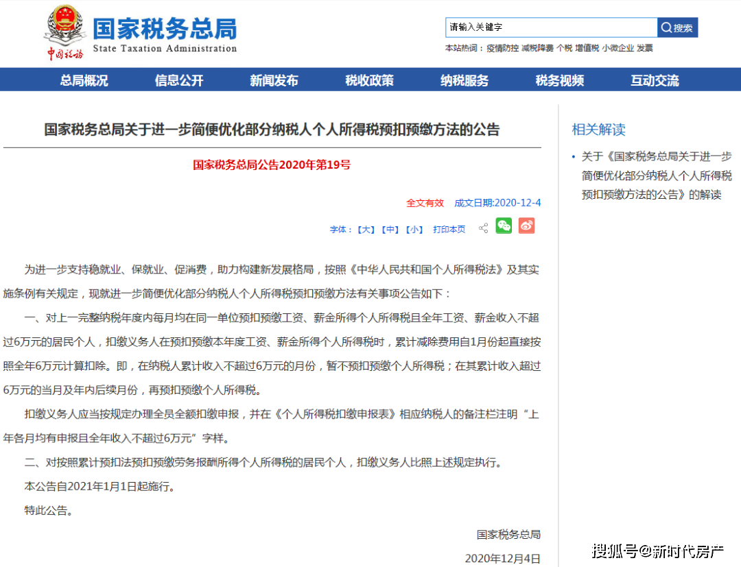 ?!豆妗凤@示,2021年1月1日起,對上一完整納稅年度內(nèi)每月均在同一單位預(yù)扣預(yù)繳工資、薪金所得個人所得稅,且全年工資、薪金收入不超過6萬元的居民個人,扣繳義務(wù)人在預(yù)扣預(yù)繳本年度工資、薪金所得個人所得稅時,累計減除費用自1月份起直接按照全年6萬元計算扣除。這意味著,納稅人在累計收入不超過6萬元的月份,暫不預(yù)扣預(yù)繳個人所得稅。