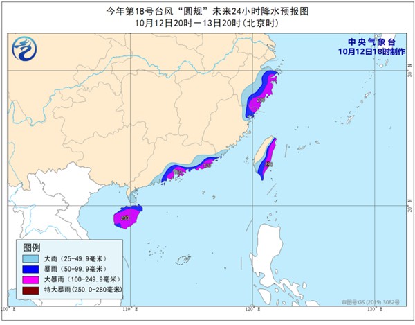 降水預報:12日20時至13日20時,臺灣島東部、浙江東部、福建東北部、廣東中東部沿海、海南島等地有大到暴雨,部分地區(qū)有大暴雨,其中臺灣島東部、海南島中部局地有特大暴雨(250-280毫米)。