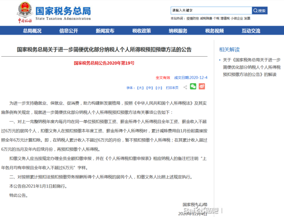 近日,國家稅務(wù)總局發(fā)布《關(guān)于進(jìn)一步簡便優(yōu)化部分納稅人個(gè)人所得稅預(yù)扣預(yù)繳方法的公告》?!豆妗凤@示,2021年1月1日起,對上一完整納稅年度內(nèi)每月均在同一單位預(yù)扣預(yù)繳工資、薪金所得個(gè)人所得稅,且全年工資、薪金收入不超過6萬元的居民個(gè)人,扣繳義務(wù)人在預(yù)扣預(yù)繳本年度工資、薪金所得個(gè)人所得稅時(shí),累計(jì)減除費(fèi)用自1月份起直接按照全年6萬元計(jì)算扣除。這意味著,納稅人在累計(jì)收入不超過6萬元的月份,暫不預(yù)扣預(yù)繳個(gè)人所得稅。